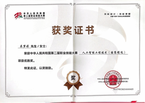 教师吴梦婷获中华人民共和国职业技能大赛优胜奖